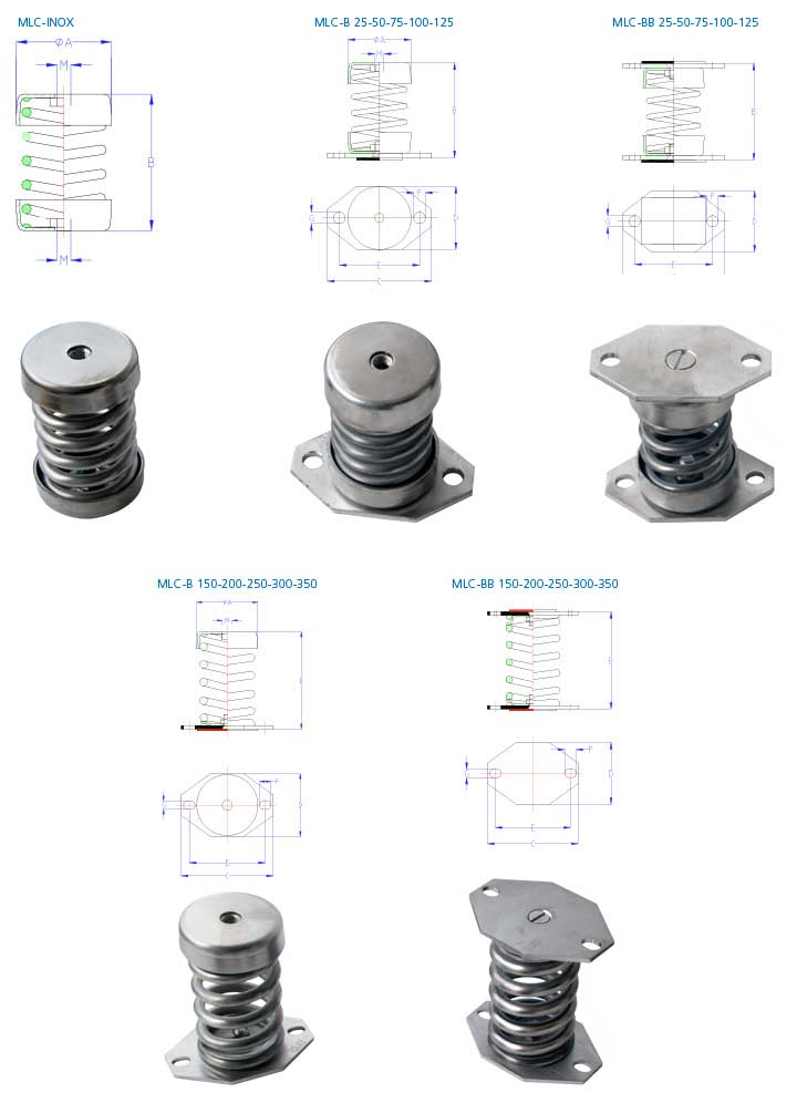 Series de aisladores diseñados para trabajar a compresión con un Aislamiento del 85% según las flechas y rpm siguientes: