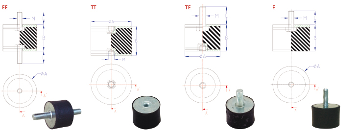 Estas suspensiones antivibratorias son utilizadas en compresión, cizalla o en combinación de compresión y cizalla (nunca en tracción) para la protección de las más severas vibraciones, choques y ruidos.