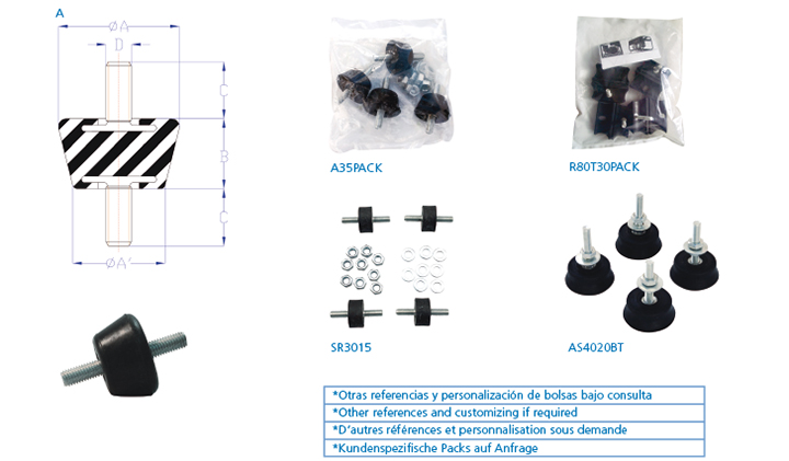 - Teniendo en cuenta las tolerancias de dureza en los elastómeros, las características mecánicas de estas soluciones antivibratorias pueden presentar diferencias.